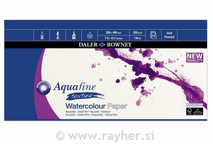 Akvarelni papir Daler Rowney Aquafine Texture ima klasično hladno stiskano površino za akvareliste, ki imajo raje rahlo teksturiran relief. Precejšnja teža 300 g/m2 nudi dobro vpojnost vode, odporna površina pa je zelo enostavna za uporabo in omogoča popravke.
