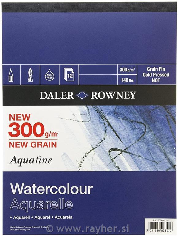 Akvarelni papir Daler Rowney Aquafine Texture ima klasično hladno stiskano površino za akvareliste, ki imajo raje rahlo teksturiran relief. Precejšnja teža 300 g/m2 nudi dobro vpojnost vode, odporna površina pa je zelo enostavna za uporabo in omogoča popravke.