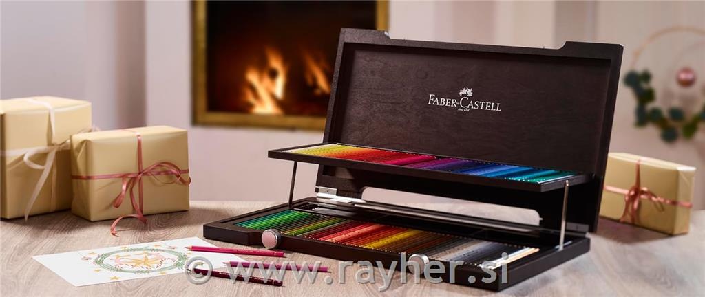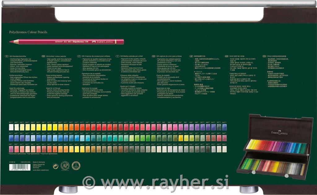 Barvice Polychromos set 120 v ročno izdelanem lesenem kovčku s kovinskim ročajem. Debelina barvne mine je 3,8mm. Konica je mehka, barve pa izredno zelo intenzivne. Uporabljeni so visokokakovostni pigmenti brez kisline, značilna pa je tudi zelo dobra obstojnost pigmenta pri izpostavljenosti sončni svetlobi. Nanos je vodoodporen in se ne razmaže. Leseni ovoj barvnih svinčnikov je dobro odporen proti lomljenju, kar omogoča sekularna vezava.