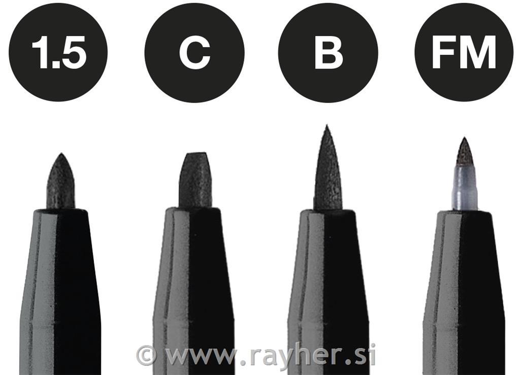 Set vsebuje: 1.5 mm, C = Calligraphy nib, B = brush tip, Fude Medium = brush tip