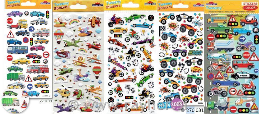 V setu je pet pol nalepk Tweeny ( puhaste izbočene nalepke) z motivi prevoznih sredstev; avtomobili, letala, tovornjaki, motorji,...