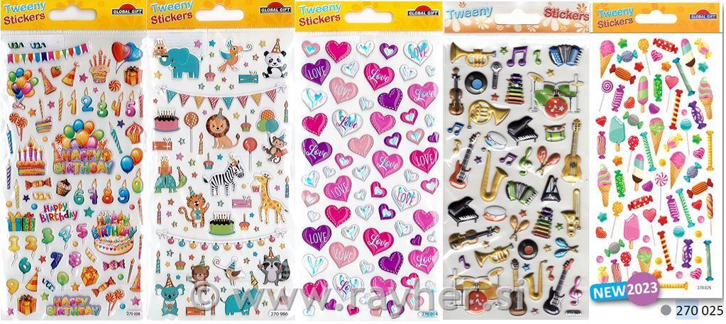 V setu je pet pol nalepk Tweeny ( puhaste izbočene nalepke) na temo praznovanja; različni pripomočki za prazovanja, srčki, torte, sladice...