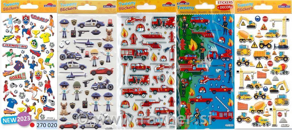 V setu je pet pol nalepk Tweeny ( puhaste izbočene nalepke) z motivi za fante; šport, gasilci, delovni stroji, policisti.