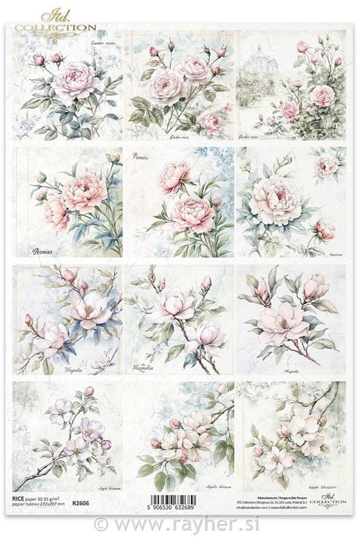 Decoupage papir, rižev A4, Vrtnice in cvetje