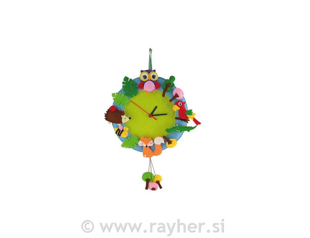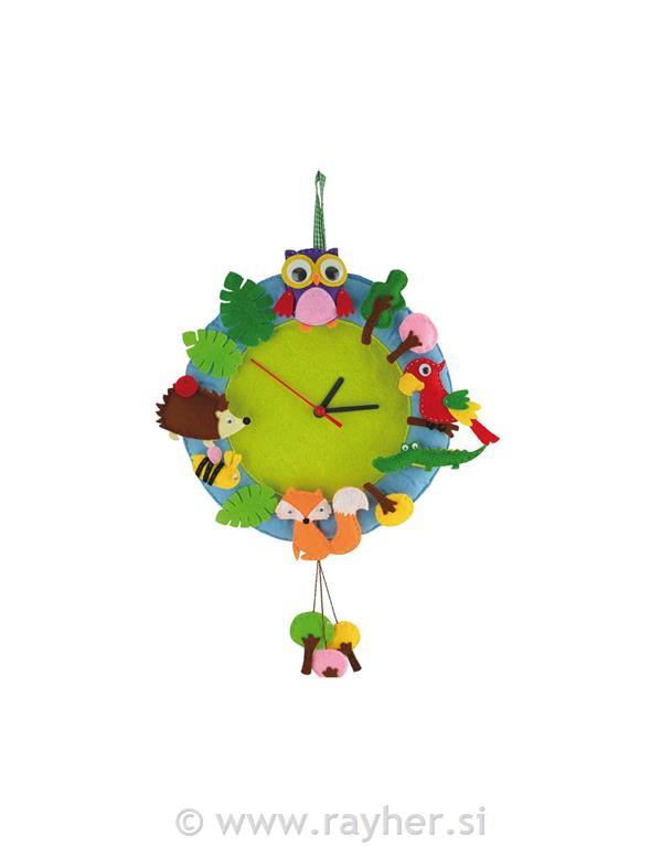 3. Zašijte dva zelena in modra kroga, napolnite s polnilom. Na vrhu prišijte trak za obešanje, na dnu pa prišijte vrvice z drevesi. Prišijte živali in okraske na mesta, kjer so sicer številke od uri.