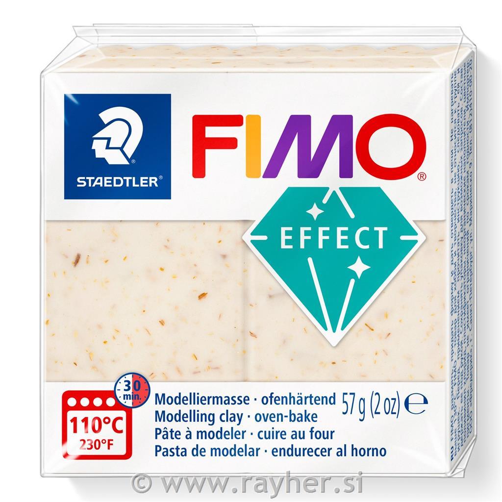 FIMO EFFECT je modelirna masa, ki je preprosta za uporabo in se lahko utrdi v domači kuhinjski pečici pri temperaturi 110°C. Čas utrjevanja je približno 30 minut. Z mešanjem osnovnih barv lahko dosežete poljuben odtenek, neutrjen FIMO lahko znova in znova pregnetete in preoblikujete. Utrjenemu izdelku se lahko doda FIMO in se ponovno utrdi, pod pogojem, da izdelek še ni bil barvan ali lakiran. Dokončan izdelek ni prepusten za vodo, lahko ga umijete.