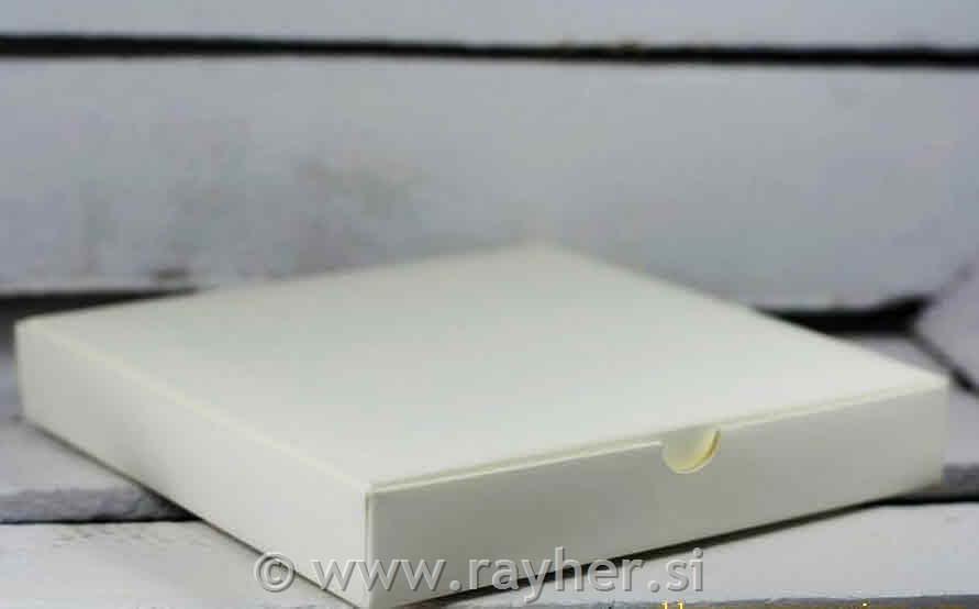 Velikost 15x15x3,5 cm, iz visoko kakovostnega krem kartona, teža 300gm2.