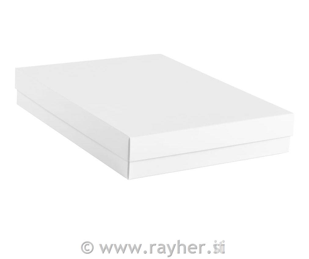 Velikost 12,4x17,2x3,5 cm, iz visoko kakovostnega belega kartona, teža 300gm2.