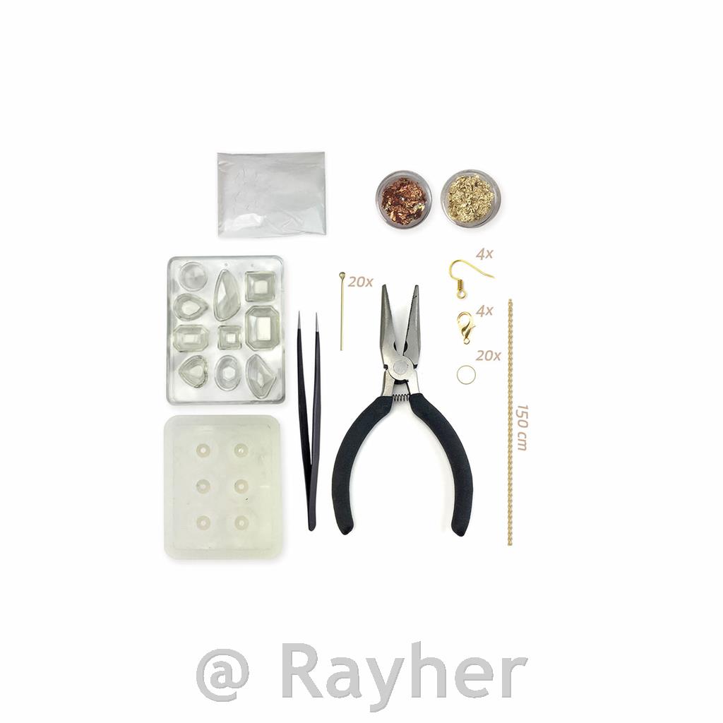 Ta čudovita škatla vsebuje: beli beton, 2 kalupa - 1 za perlice, 1 za obeske, zlate in bakrene lističe v plastični škatli, verižico, 4 zaponke, 20 prstanov, 4 uhane, 20 žebljičkov za oči, orodje za nakit, pinceto, 1 navodilo za izdelavo z modeli.