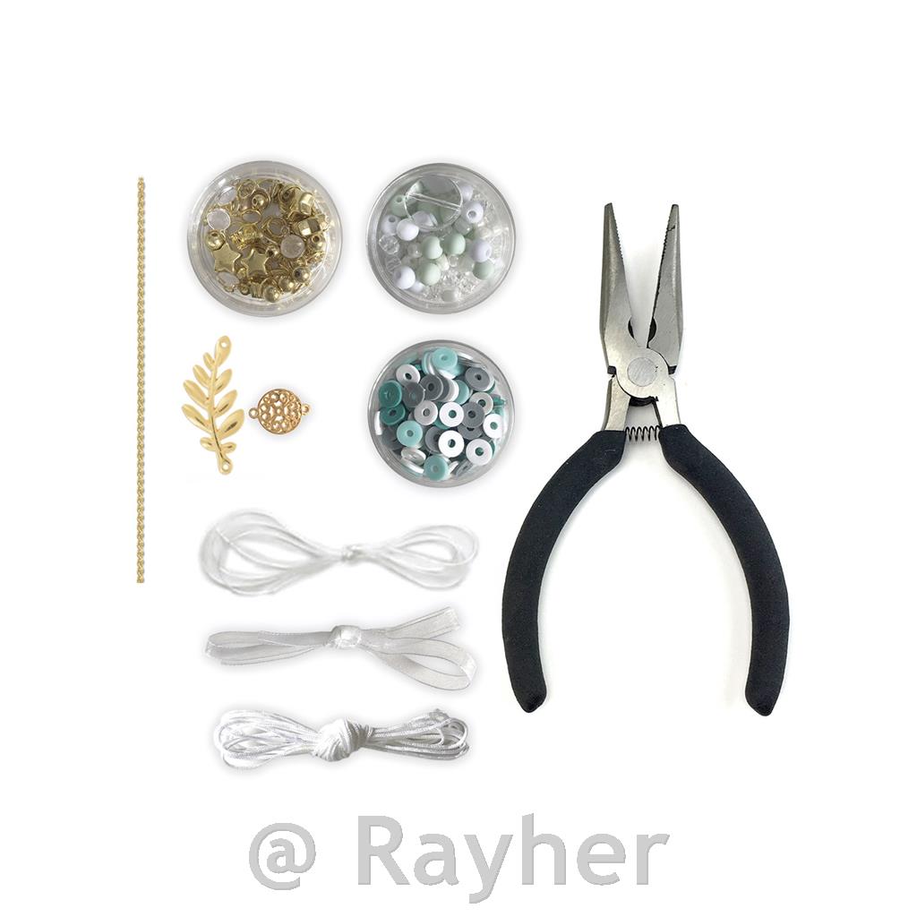 Set vsebuje: belo vrvico, verižico, različne perlice, obeske, 10 zaponk, 30 prstanov, klešče za nakit, organza vrečko in slikovna navodila s predlogami.