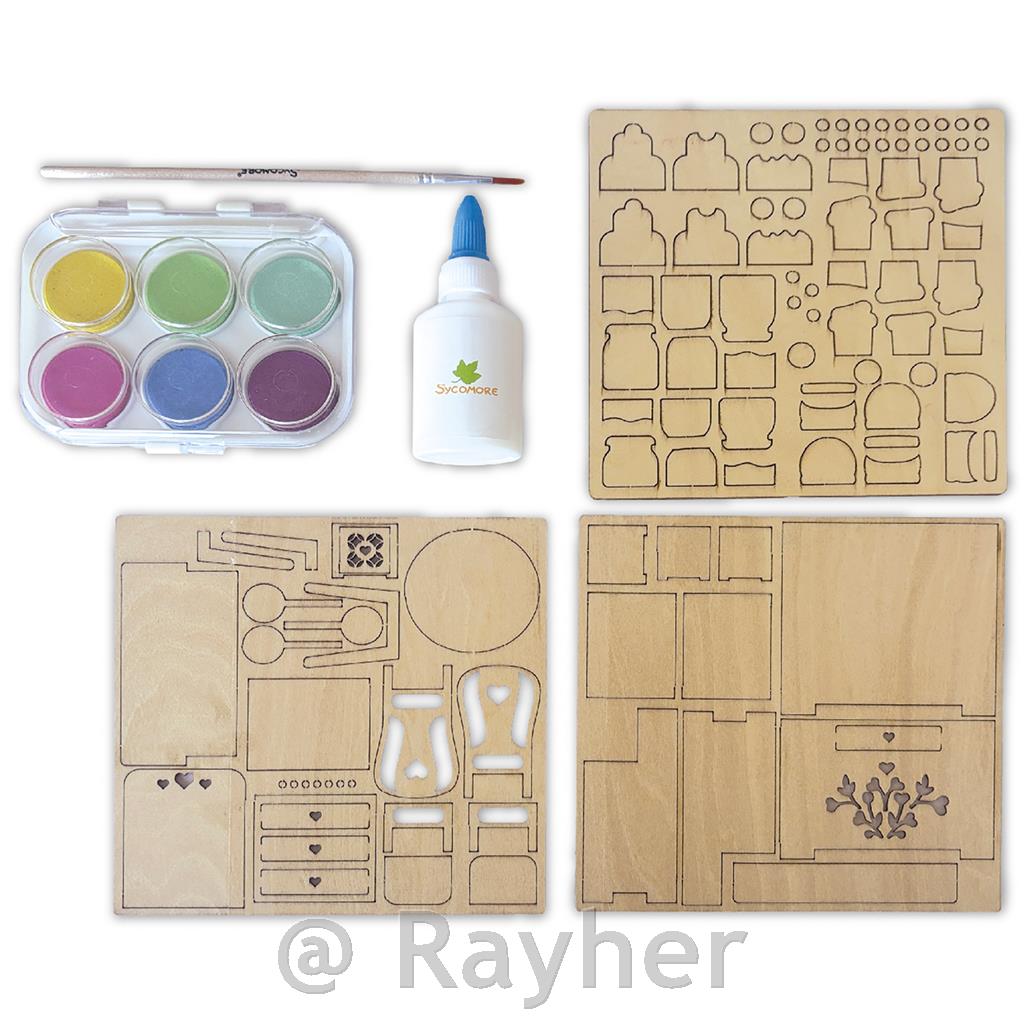 Natisnjeno škatlo spremenite v miniaturno trgovino s sladkarijami – hkrati dekorativno in praktično, saj služi tudi kot škatla za shranjevanje! Sestavite leseno pohištvo – lahko ga celo pobarvate. Vključuje: 2 vnaprej izrezana lesena lista, lepilo, 6-barvno paleto barv, 1 čopič, 10 lesenih perlic v obliki torte in knjižico z navodili.