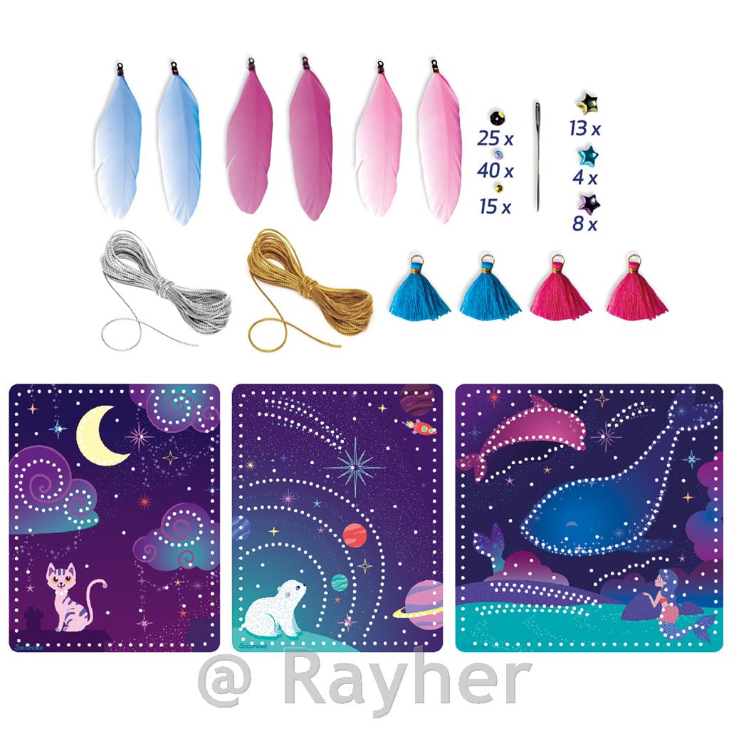V tej čudoviti škatli boste našli vse, kar potrebujete za ustvarjanje 3 ilustriranih in vezenih voščilnic, okrašenih z zlato nitjo, bleščicami in zlatimi perlicami različnih oblik. Vsebina: 3 tiskane voščilnice, zlata nit, perje, perlice, obeski in navodila po korakih, ki vas bodo spremljala skozi vaše ustvarjanje.