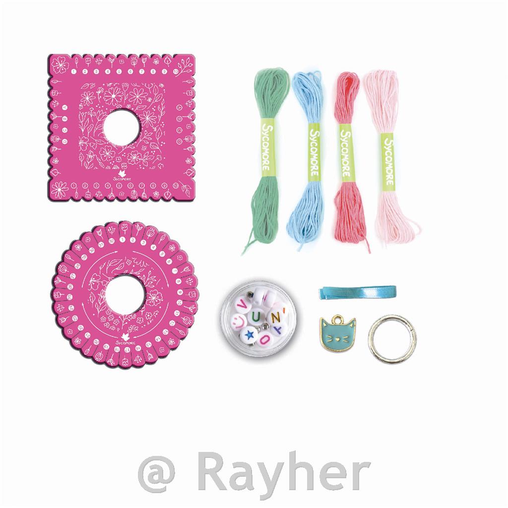 V tej škatli Bijoux odkrijte vse, kar potrebujete za izdelavo čudovitih zapestnic prijateljstva Kumihimo (japonsko pletenje). Komplet vsebuje: 2 pletena diska Kumihimo, 4 bombažne niti, 1 obesek z mačko, perlice z barvnimi črkami, mini srebrne kocke in 1 knjižico z navodili.