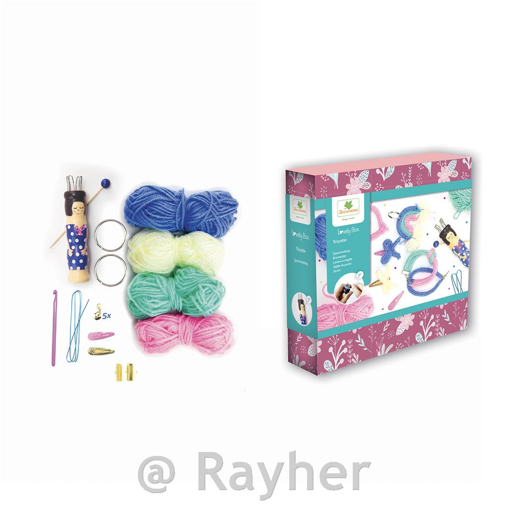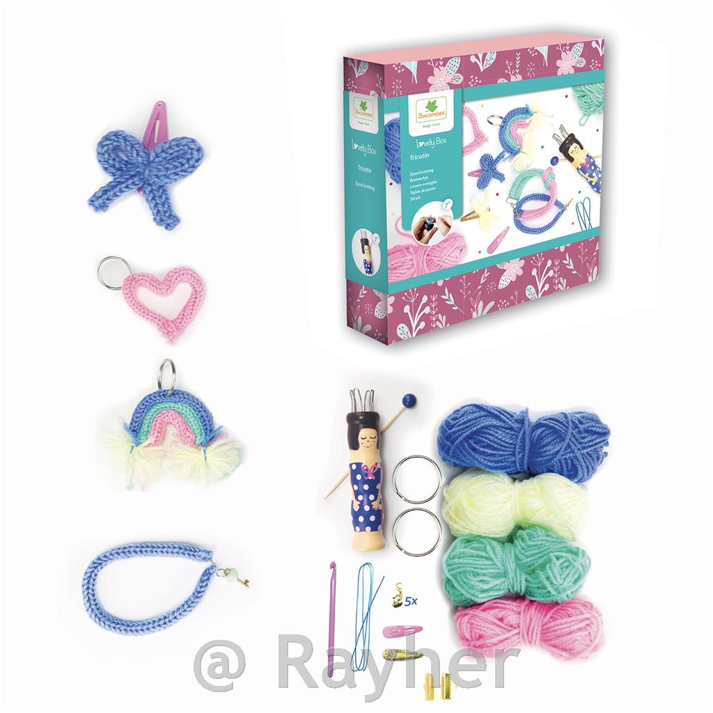 Ustvarite čudovite mehke dragulje! Nič ni preprostejšega s tem pletenjem in vsemi dodatki iz tega lepega kovčka. Vsebina: 1 lesena pletenica, 1 pletilka, 1 kvačkanje, 4 klobčiči volne (roza, zelena, bela, vijolična), 2 prstana, 2 lasni sponki (roza in zlata), 2 zaponki, 1 kovinska nit, 5 obeskov, 1 knjižica z navodili.
