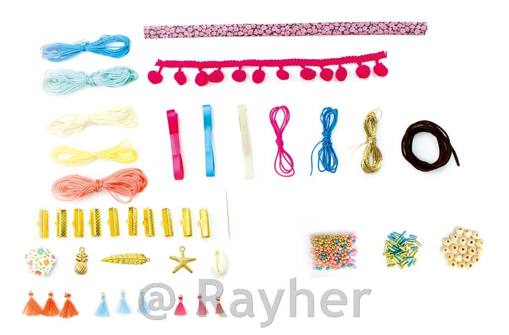 V tej čudoviti darilni škatli boste našli vse, kar potrebujete za ustvarjanje teh slavnih trendovskih večplastnih zapestnic! Ta ljubka škatla vsebuje: 25 m bombažne niti, 1,5 m voščene niti, 100 perlic, 16 lesenih perlic, 30 cevastih perlic, 25 cm usnjene niti, 25 cm traku s cofki, jeklene obeske, 1 školjko, 1 potiskano perlico, 75 cm traku, 5 verižic + zaponk, 10 velikih zaponk, 1 iglo, 9 cofkov, 25 cm potiskanega traku, 2 podpori za zapestnice in 1 knjižico z navodili.