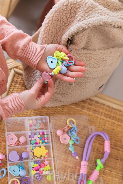 Ustvarite svoj moden nakit in dodatke s to škatlo presenečenj! V tej lepi škatli boste našli vse, kar potrebujete za domišljijo in ustvarjanje edinstvenih, pisanih in 100 % elegantnih kosov! Ogrlice, zapestnice ... in tudi čudovite obeske za ključe, ki jih lahko pripnete na torbo, ter zabavne vrvice v barvi sladkarij, da bodo vaši najljubši dodatki vedno pri roki.