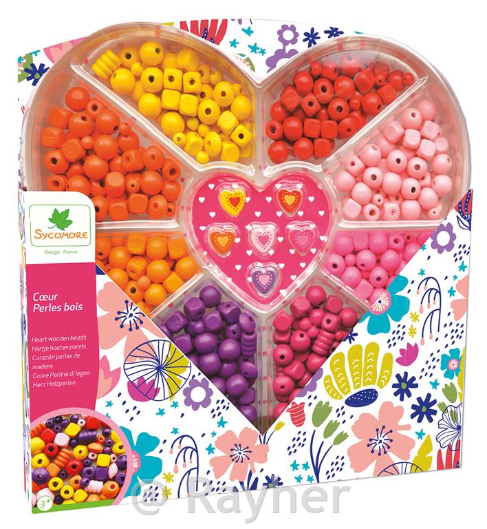 Škatla v obliki srca z barvnimi lesenimi perlami. 400+ perl (8 barv) / 6 perl v obliki srca, 3 m niti za ustvarjanje trendovskega nakita.