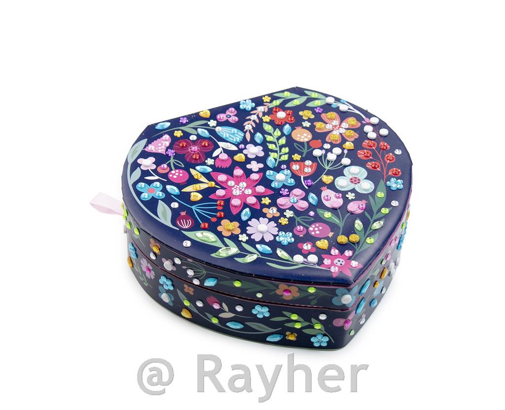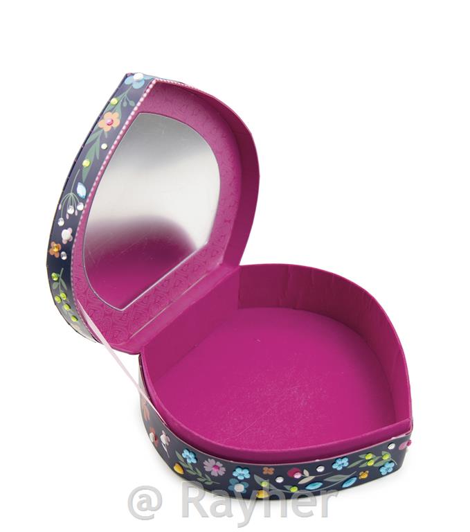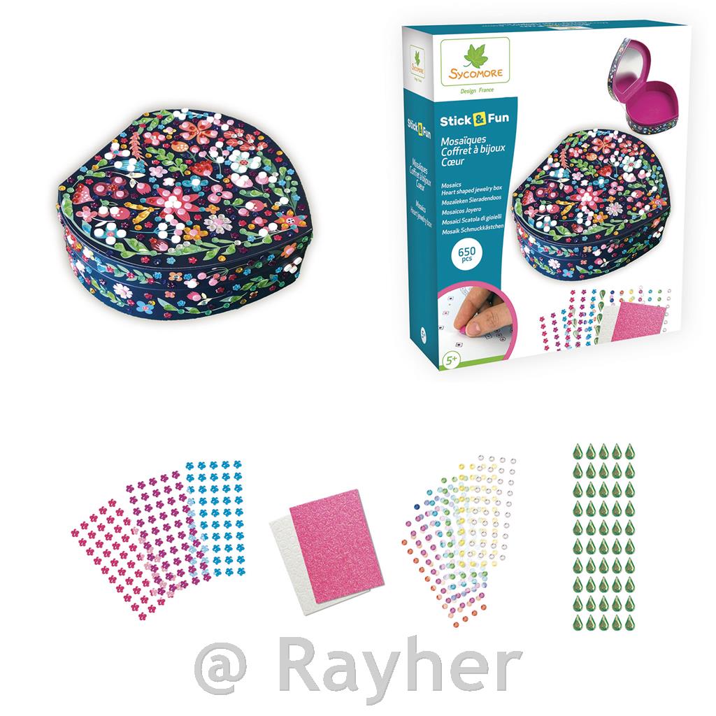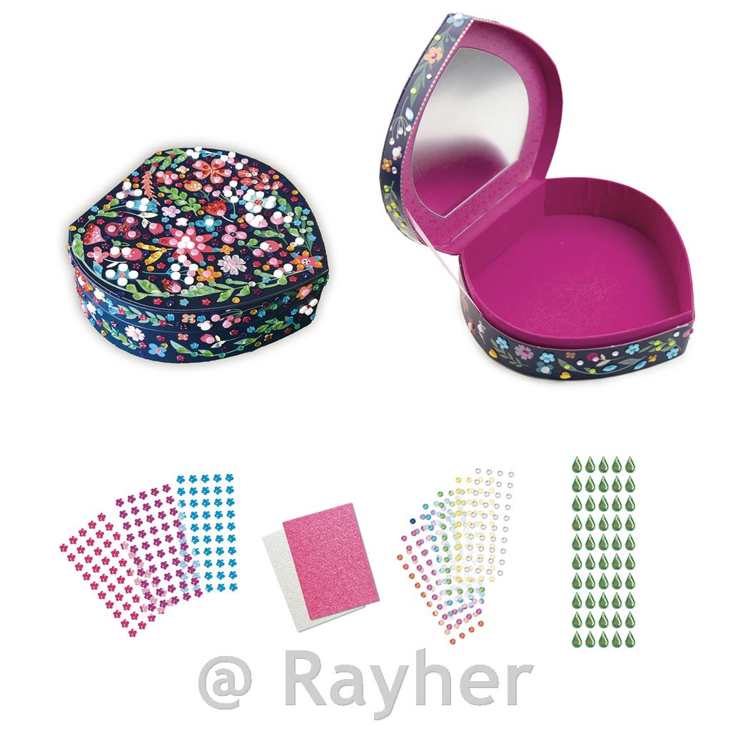 Izdelajte čudovito škatlico za nakit v obliki srca, preprosto nalepite majhne bleščeče dragulje in penaste nalepke na ustrezne grafike. Vsebuje: 1 škatlico za nakit v obliki srca (20 x 6 x 18,5 cm), več kot 500 barvnih mozaikov, 150 draguljev in 1 navodilo za uporabo.