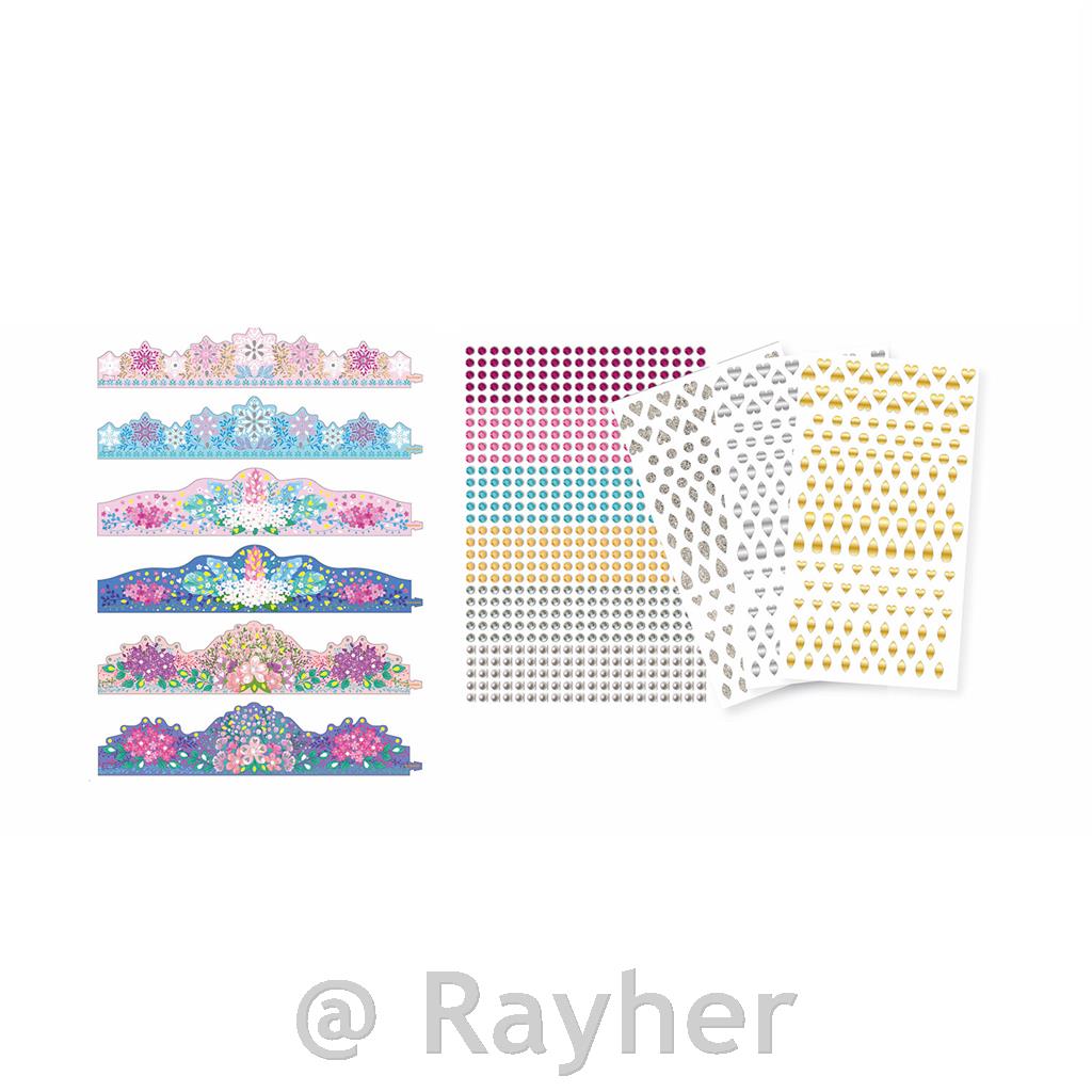 Set vsebuje 6 kron za okrasitev s kristali in svetlečimi ali kovinskimi nalepkami ter slikovna navodila.