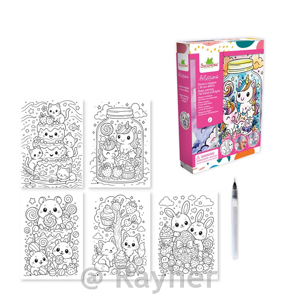 S čarobno barvo ste umetnik! Set vsebuje 5 slik (20 x 14 cm), čopič z vodno rezervo in slikovna navodila. Ob stiku z vodo se barve na slikah magično prikažejo.