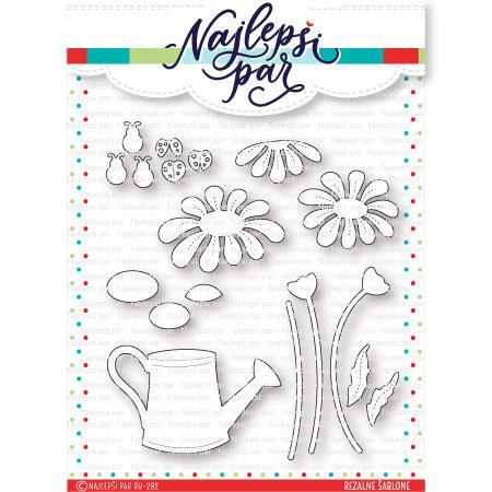 Mere nekaterih rezalnih šablon: marjetice 5,4 x 3,6 cm; 4,3×3,4 cm; 3,7 x 1,8 cm; zalivalka 7,4 x 4,7; stebla 6,8 cm, 7,8 cm in 8 cm, pikapolonice 1,4 x 0,9 cm