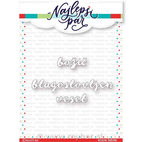 V kompletu so tri rezalne šablone, ki jih je pred uporabo potrebno ločiti. Z njimi lahko sestavimo voščilo srečen božič in blagoslovljen božič.