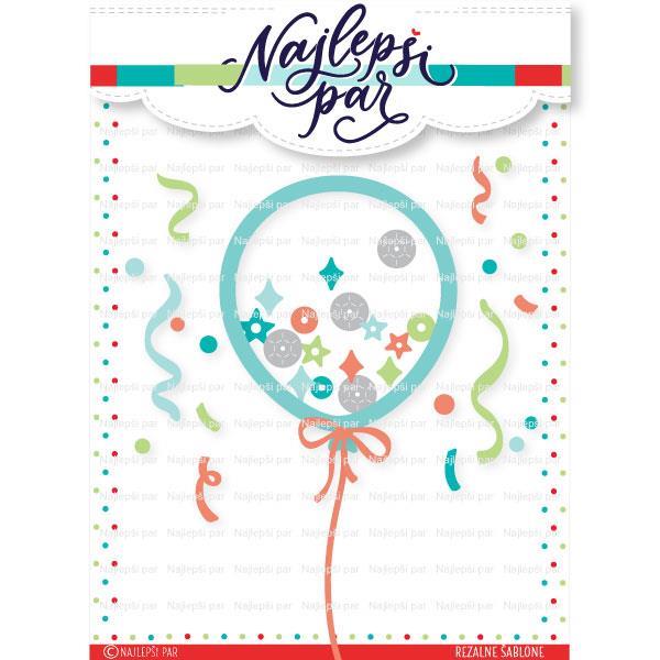 V kompletu je 10 rezalnih šablon. Izrežemo lahko balona različnih velikosti ali s pomočjo kombiniranja šablon izdelamo tresočko…saj so v kompletu tudi mali izrezki, s katerimi tresočko lahko napolnimo.