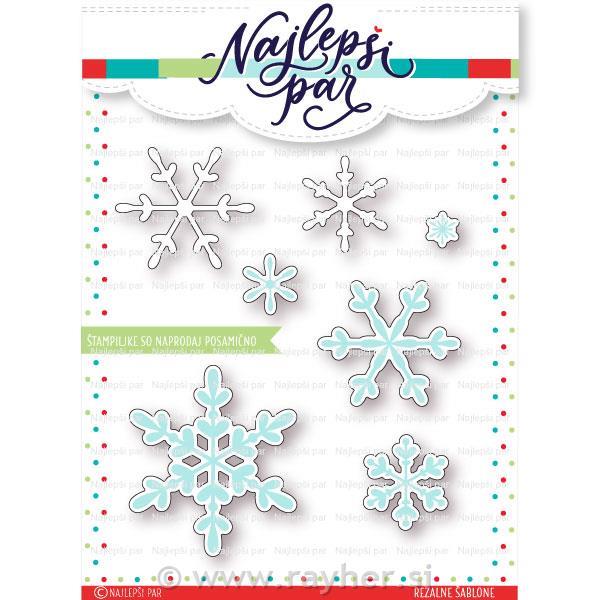 V kompletu je 7 rezalnih šablon. S petimi rezalnimi šablonami izrežemo odtisnjene snežinke iz istoimenskega kompleta štampiljk, dve snežinki pa sta samostojni in ju lahko uporabimo, da obogatimo izreze.