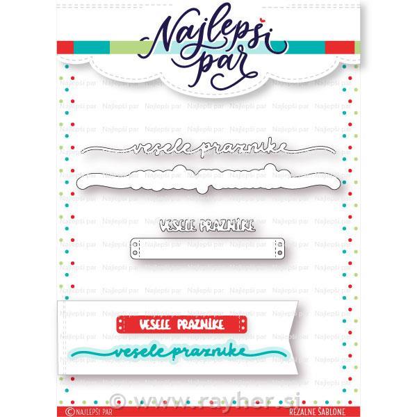 Velikosti: Prazniki na vrvici 13,2×1,1 cm, obroba 13,7×1,6 cm; trak 8×1,1 cm; vesele praznike 5×0,7 cm