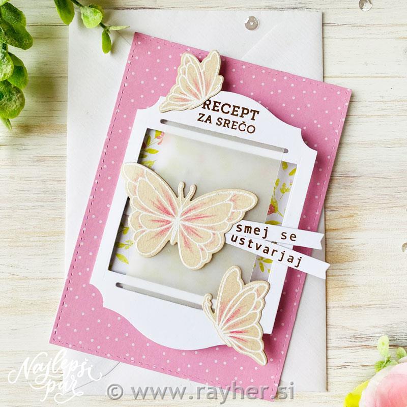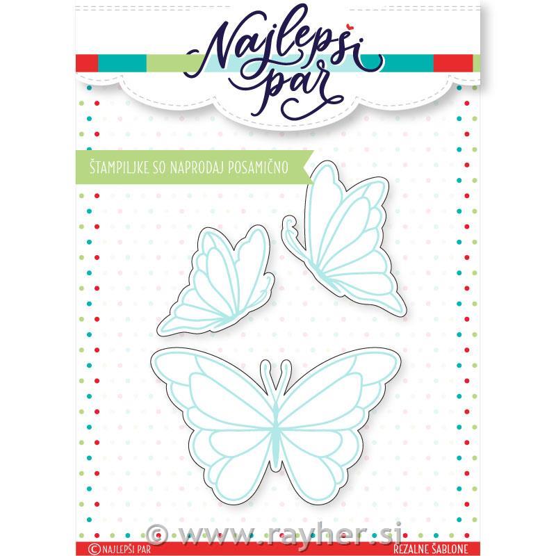 V kompletu so 3 rezalne šablone, ki izrežejo odtise metuljev iz istoimenskega kompleta štampiljk in pa dodatna šablona metuljevega telesa.