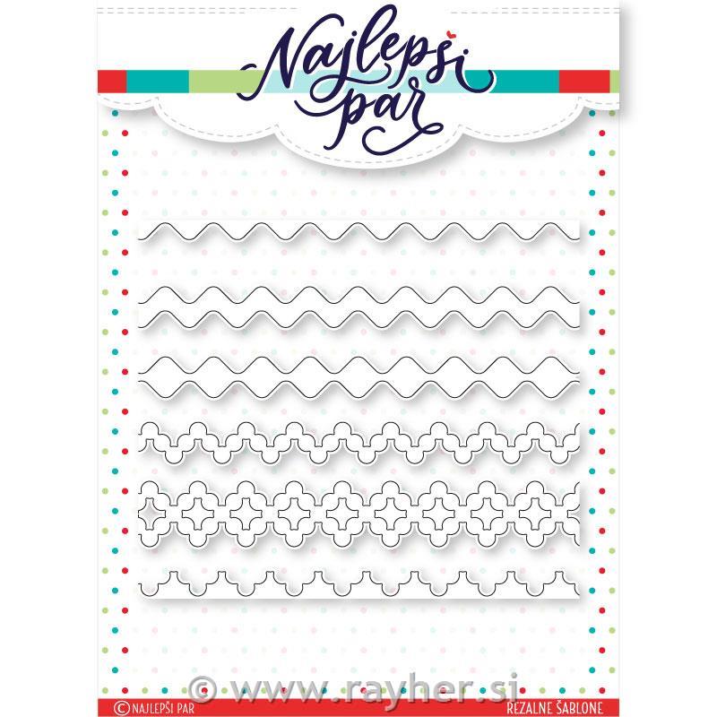 V kompletu je 6 rezalnih šablon. Z dvema rezalnima šablonama izrežemo okrasne bordure, s štirimi trakovi pa lahko bordure okrasimo ali pa trakove kombiniramo med seboj oz. jih uporabljamo samostojno.