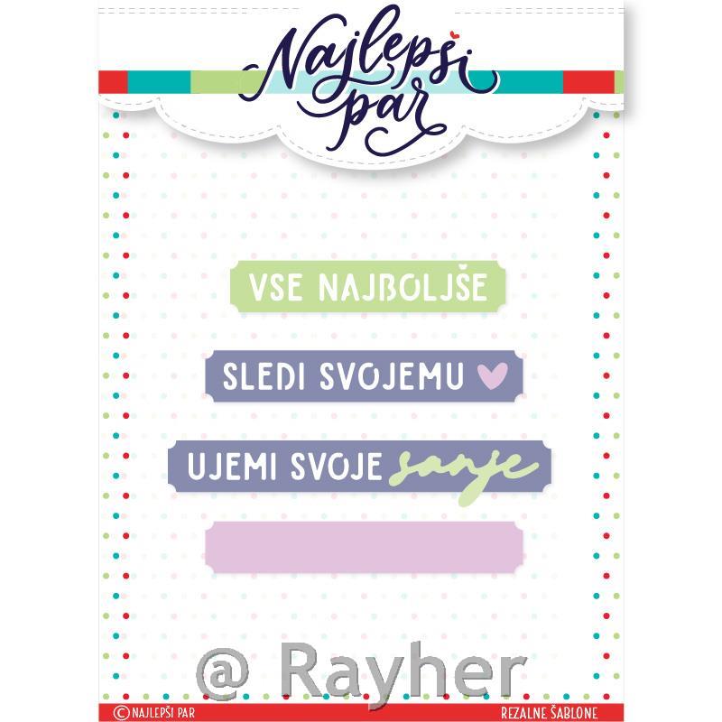 rayher.si Papir in pripomočki Sizzix, Marianne design, Ultimate Pro, SewEasy, Spirale, Quilling Sizzix, Marianne Design, Memory Box, LeaBilities NAJLEPŠI PAR - rezalne šablone, štampiljke, šablone, dodatki Rezalna šablona Sledi svojemu srcu V kompletu je 7 rezalnih šablon. Na treh trakovih je voščilo, četrtega pa lahko uporabimo kot podlago, da dobimo napis v drugačni barvi.Velikosti trakov: od 1,2 x 6,5 cm do 1,2 do 9,1 cm Aktualna cena:8,99 € Šifra artikla:TZB601 Blagovna znamka:Najlepši par – Tina Baša Zaloga: na zalogi Dodaj v košarico kos
