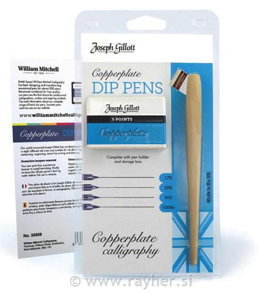 Set za kaligrafijo Copperplate, ki vsebuje komolčno držalo in štiri peresa iz serije Gillot - gre za izjemno fina, precizna peresa, ki z uporabo v priloženem držalu pred vami zarisujejo črke v kaligrafskem slogu Copperplate.