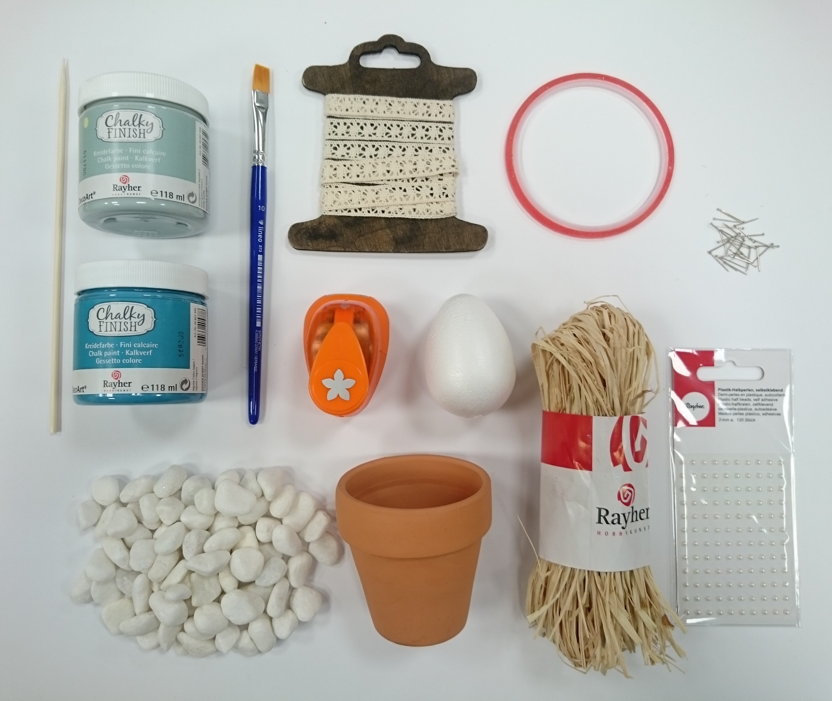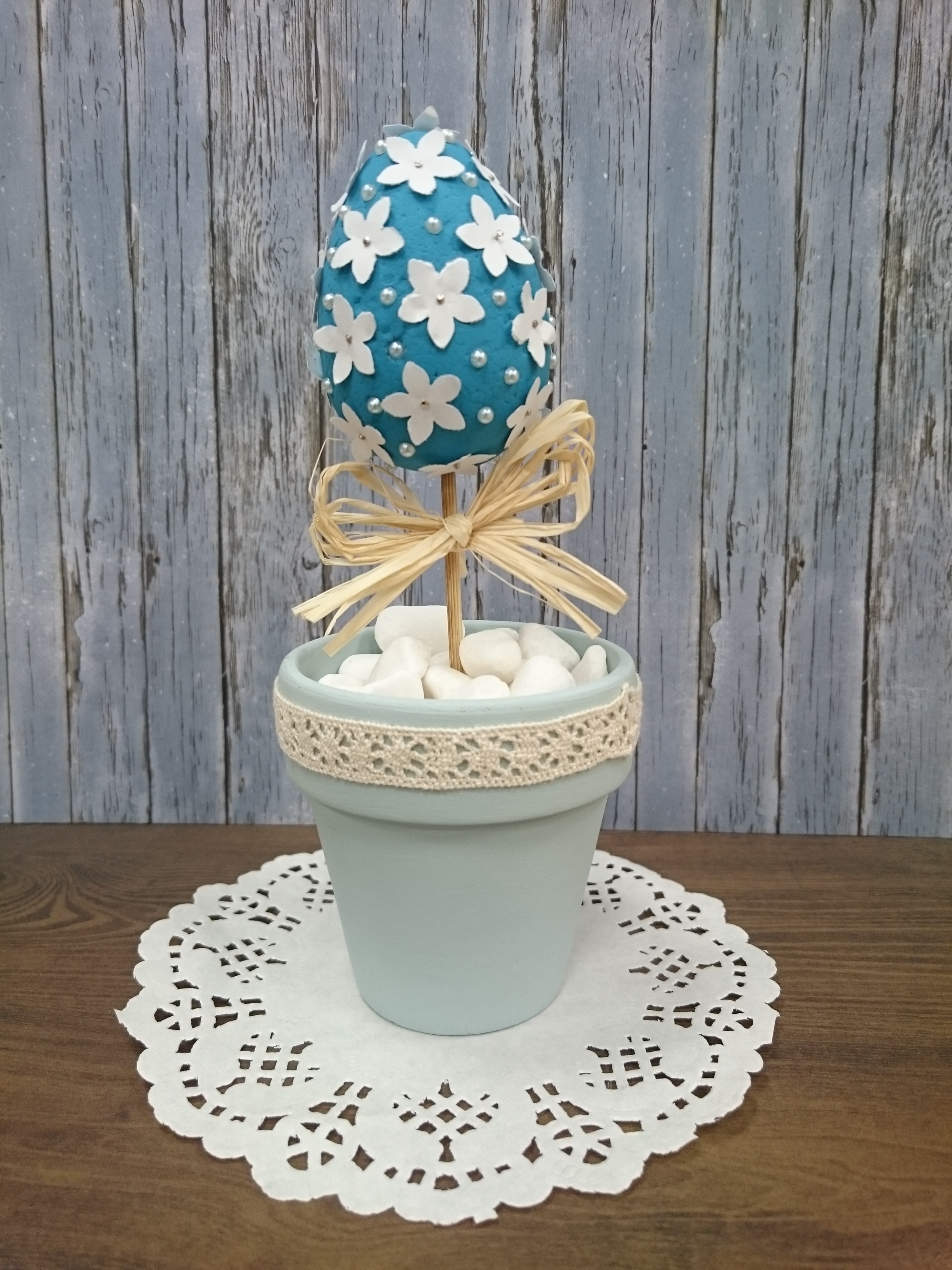 Okrog lončka z obojestranskim lepilnim trakom prilepimo čipkast trak. V lonček nasujemo bele kamenčke in na sredino zapičimo okrašeno jajce na palčki, okrog katere zavežemo še pentljo iz rafije.