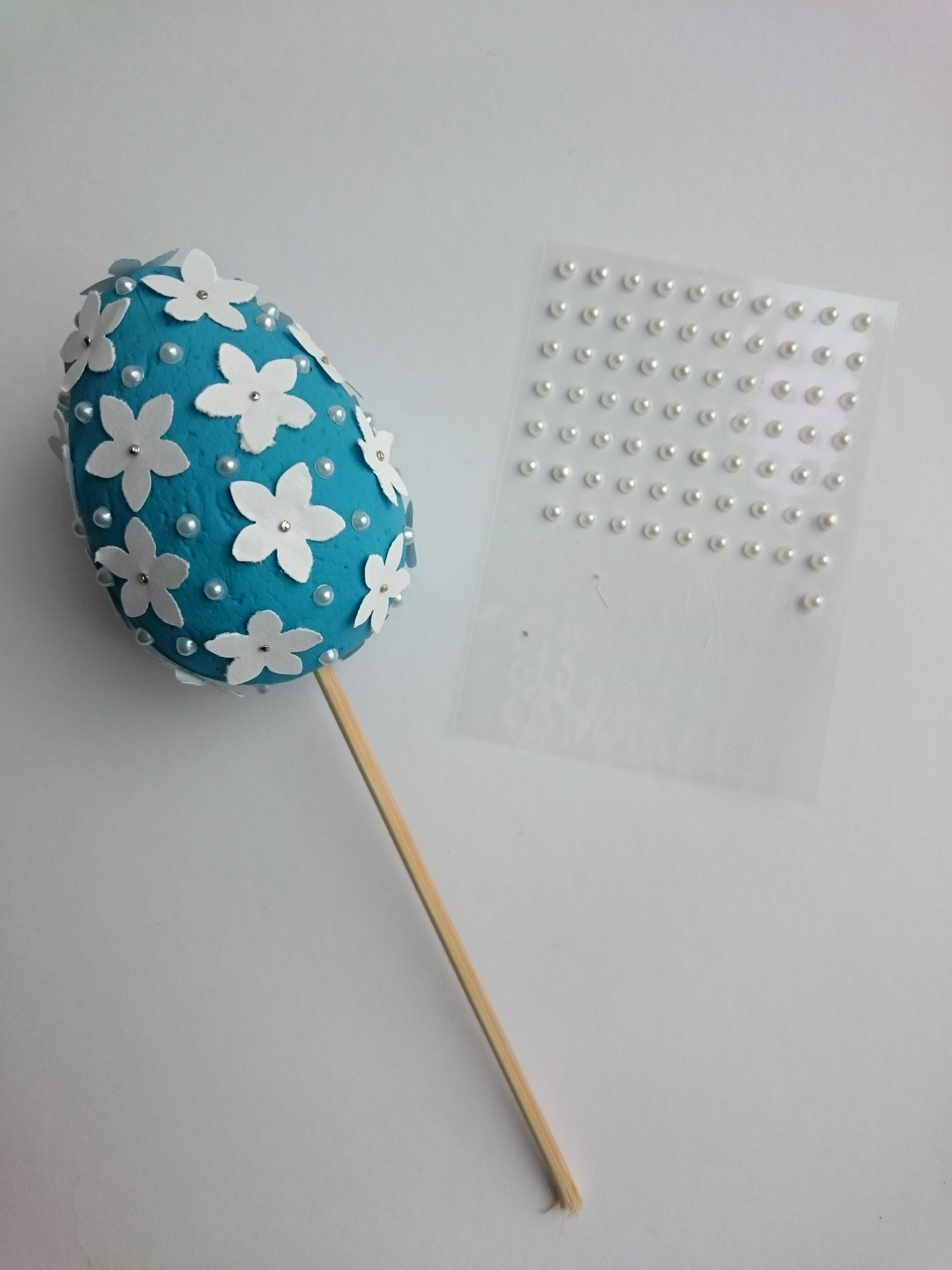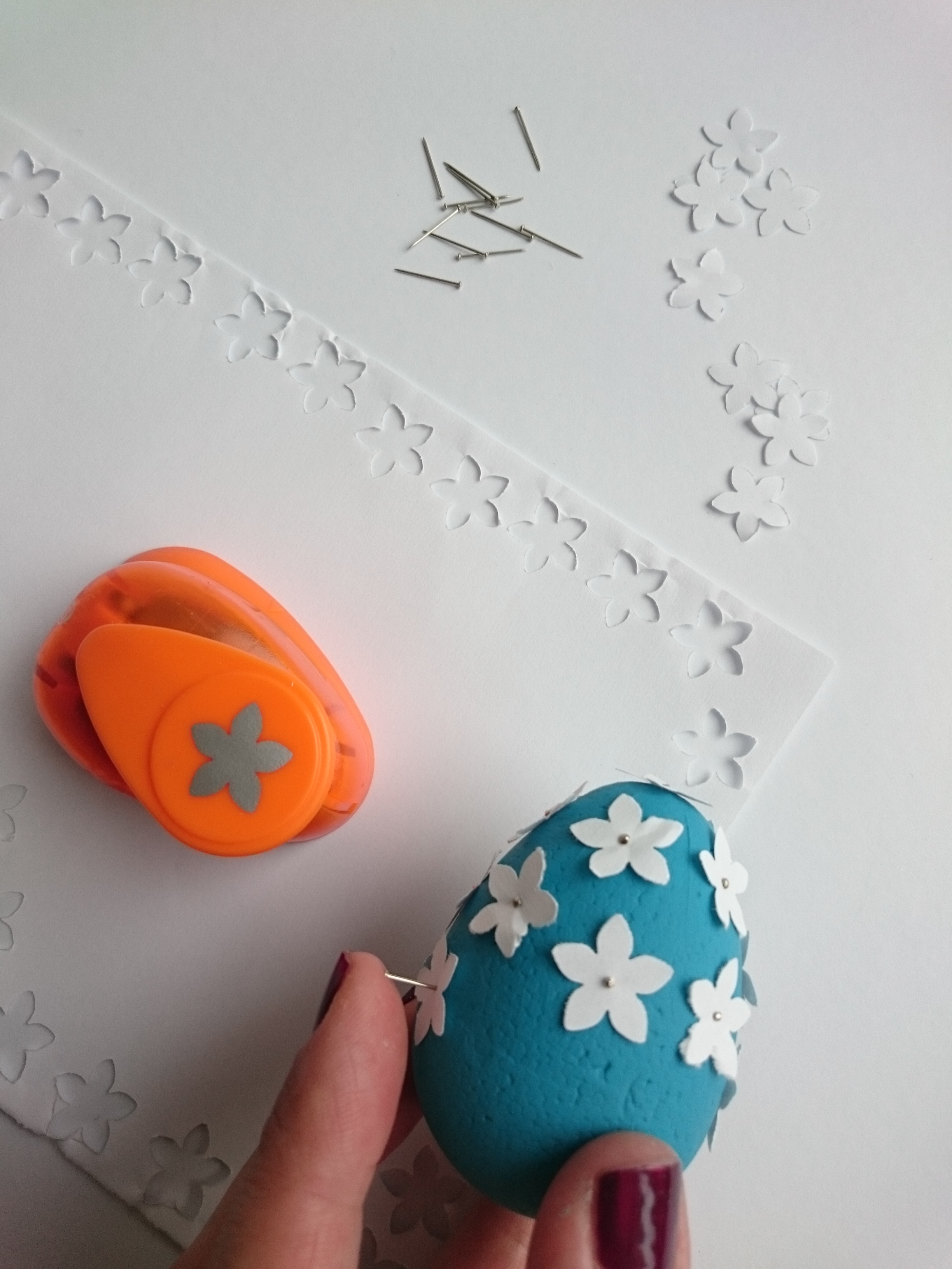 Iz papirja z luknjačem izsekamo bele cvetove, ki jih na pobarvano jajce pritrdimo z bucikami. Med cvetove prilepimo samolepilne polovične perle.