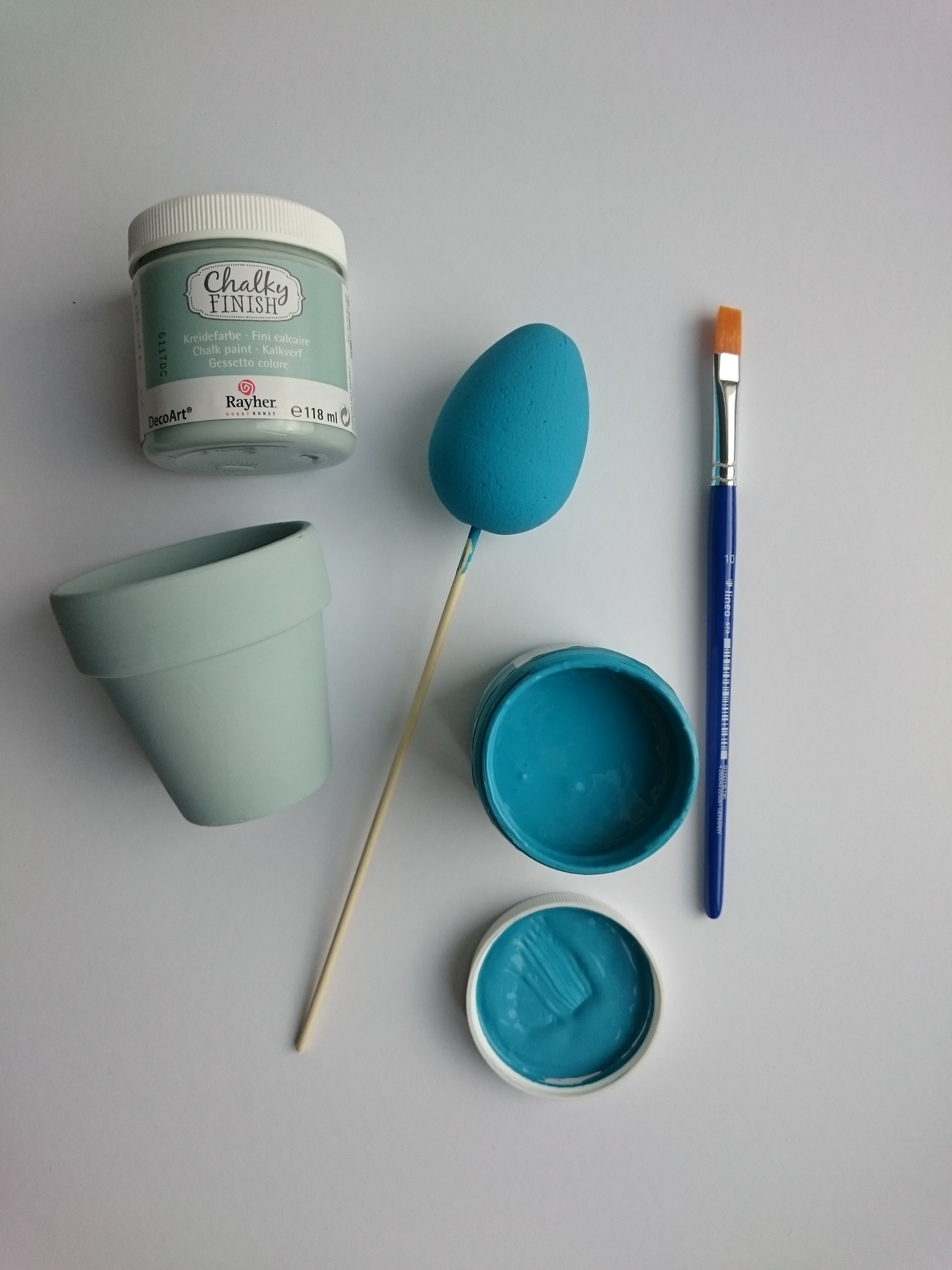 Stiroporno jajce namestimo na leseno palčko in ga pobarvamo z izbranim odtenkom barve Chalky Finish. Pobarvamo tudi lončen cvetlični lonček.