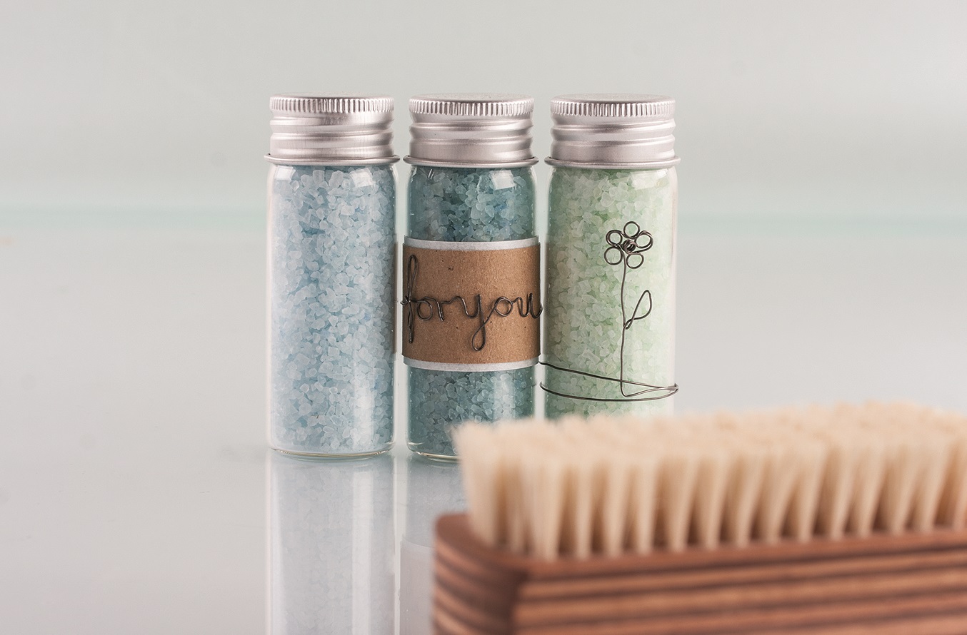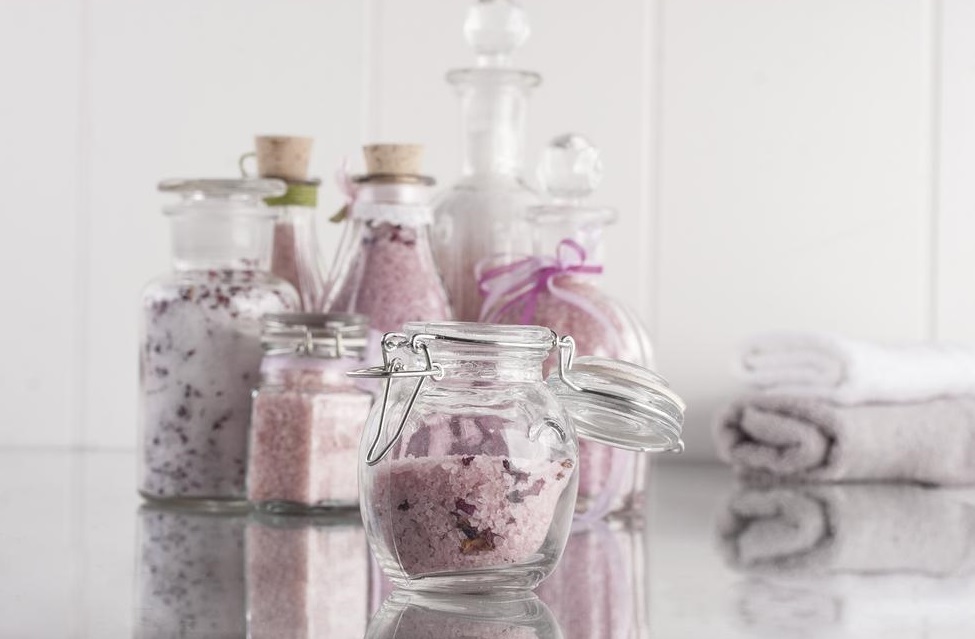 Kopalna sol v stekleni posodi je lahko lepo darilo in dekoracija v kopalnici.
