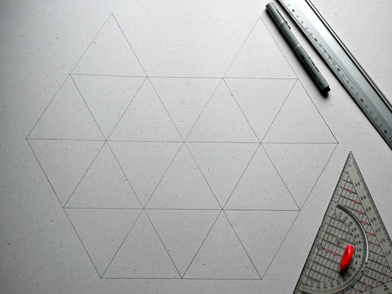 Za škatlico uporabimo fotokarton, na katerega natančno narišemo vzorec/šablono kot kaže slika. Vsi trikotniki morajo biti enakostranični.