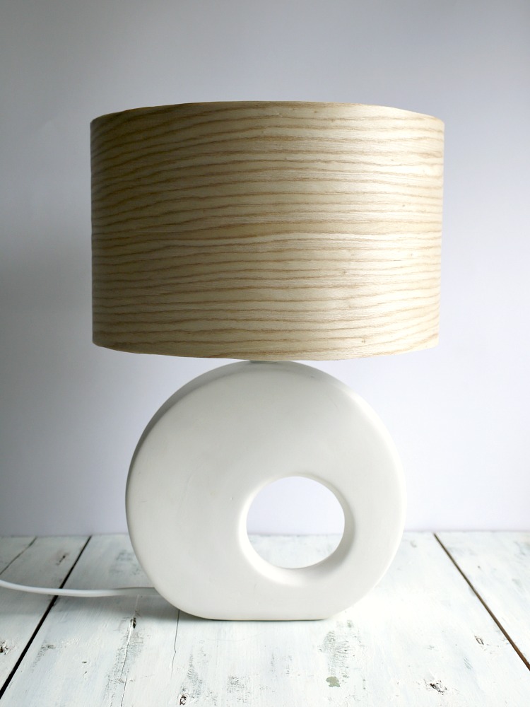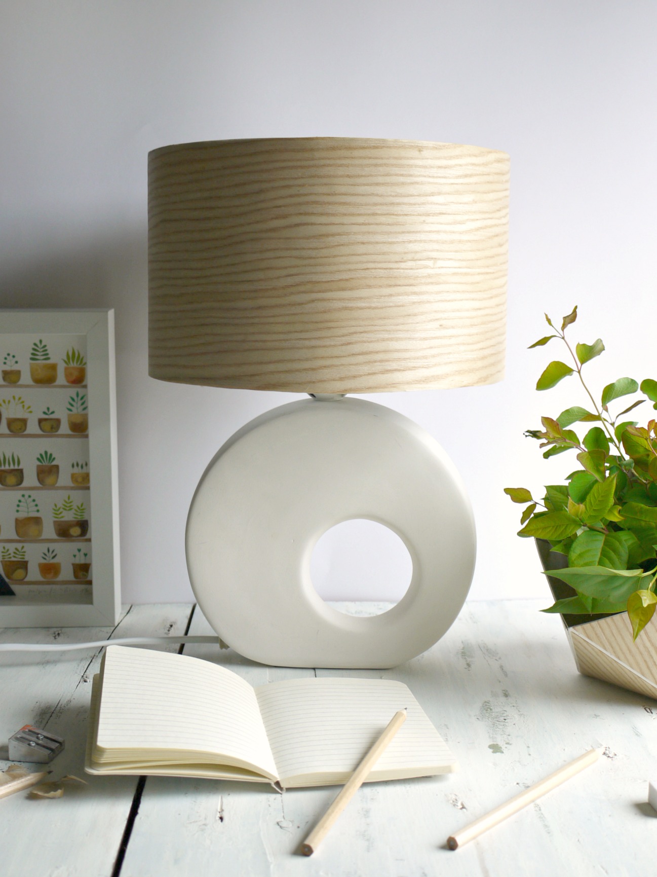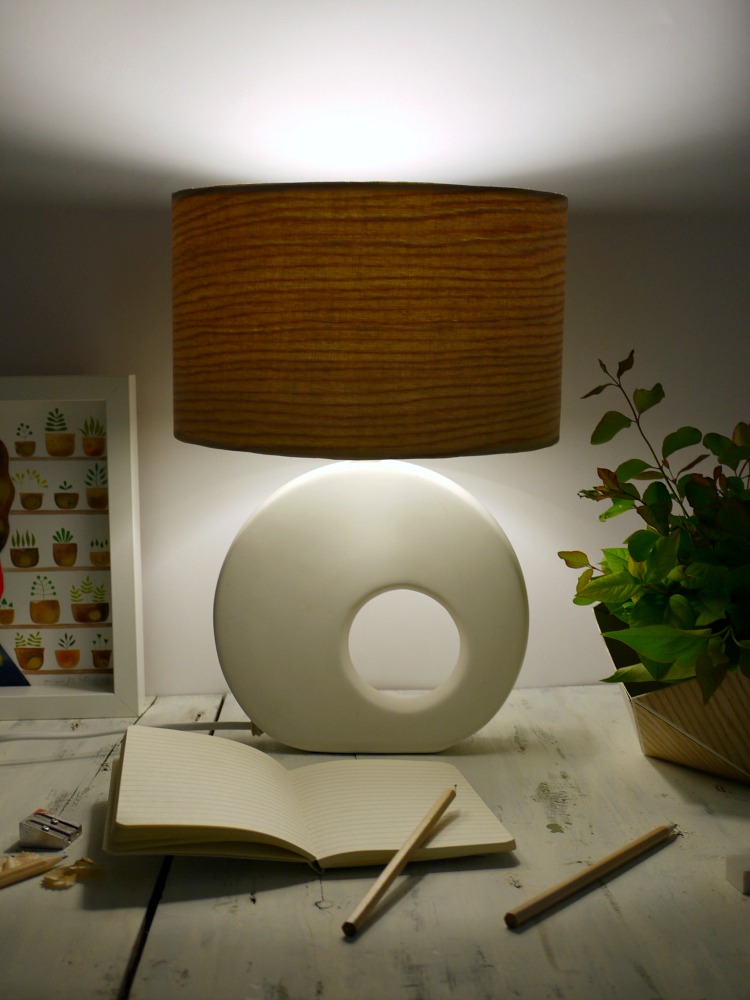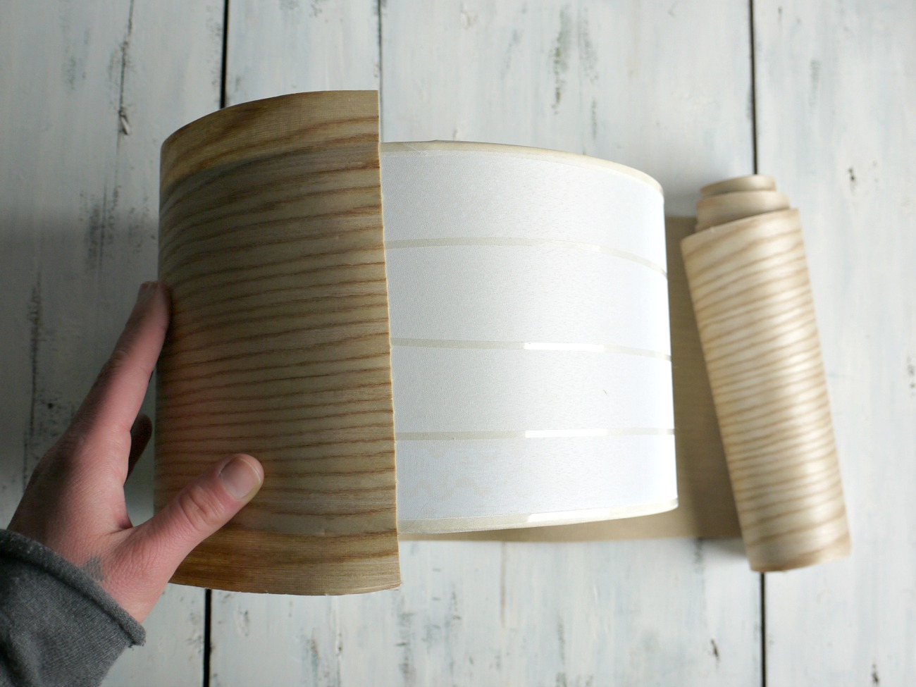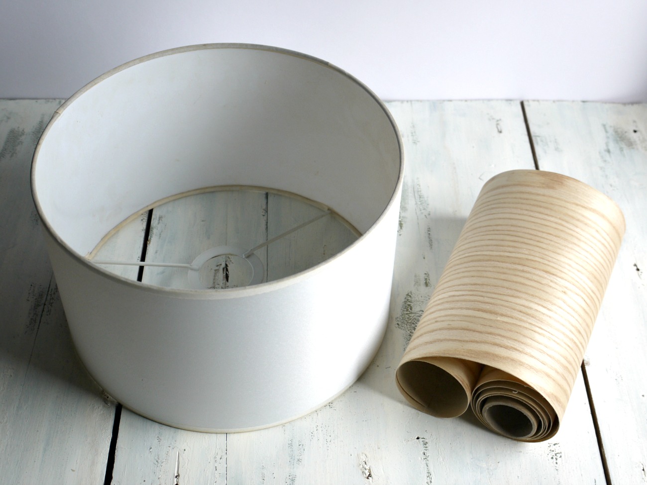 Potrebujemo: - tkanino s furnirjem, - senčnik za luč, - podstavek za luč, - dvostranski samolepilni trak, - ravnilo, - olfa nož ali skalpel, - škarje. Dekoracija senčnika v videzu lesa je povsem preprosta. Senčnik oblepimo z dvostranskim samolepilnim trakom. Na senčnik prilepimo tkanino, robove tkanine s furnirjem pa odrežemo.