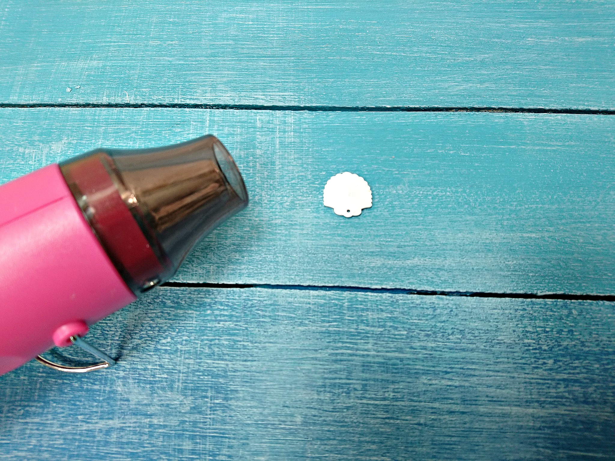 Iz bele skrčljive folije z Big Shotom in šablono izrežemo en komplet školjk in tri morske zvezde. Dve zvezdi bomo uporabili za uhane. Vse elemente preluknjamo z ustrezno velikim luknjačem, saj se ob krčenju tudi luknjice zmanjšajo.