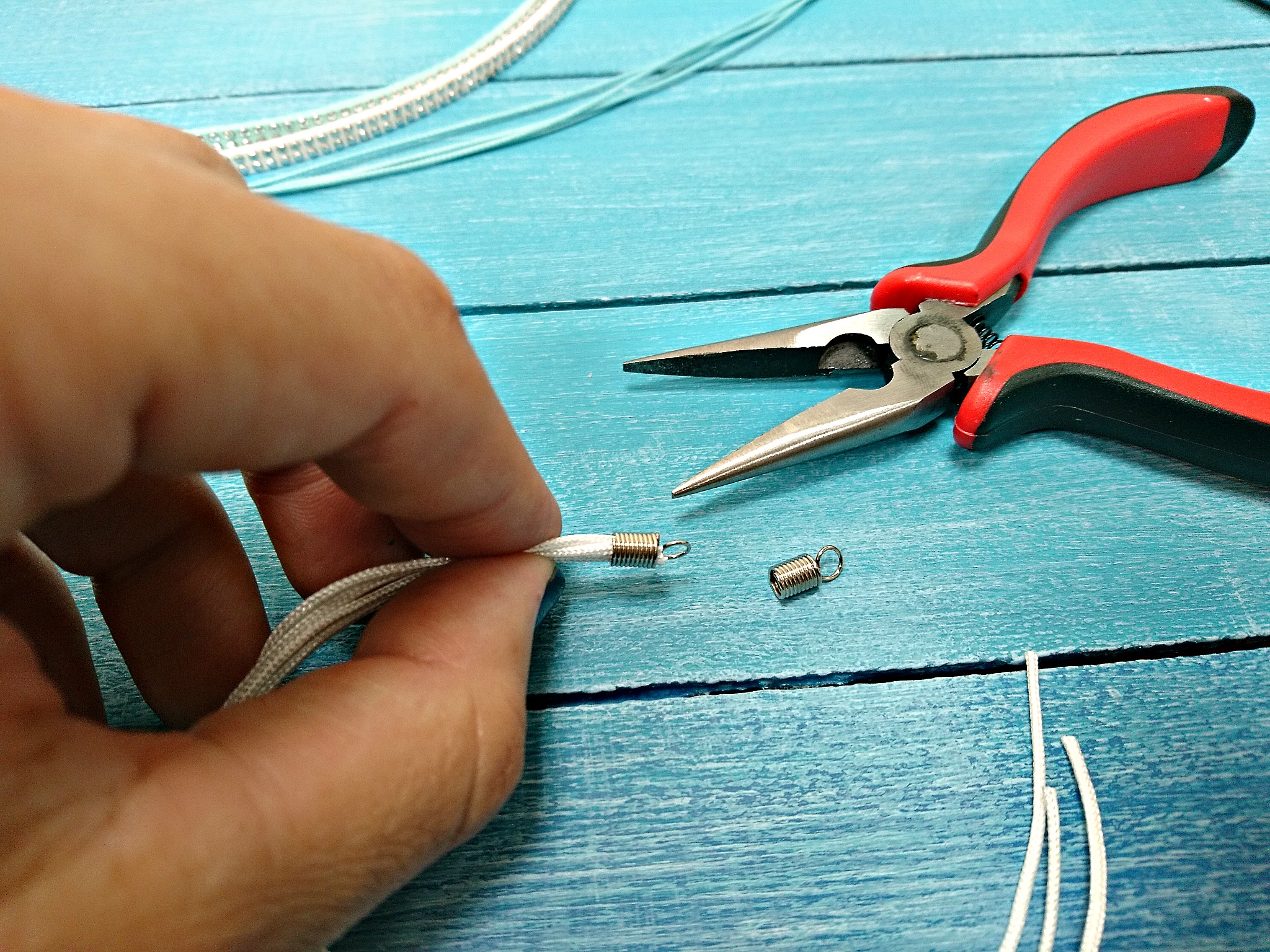 V zaključek za vrvico položimo 4 turkizne povoščene vrvice in zaključek stisnemo najprej z ene, potem pa še z druge strani.