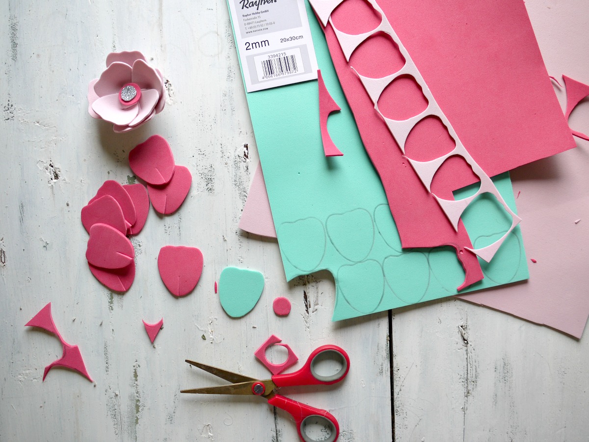 Iz penaste gume izrežemo in oblikujemo cvetove, rog in ušesa. Nato jih z lepilno pištolo nalepimo na pokrov škatle.