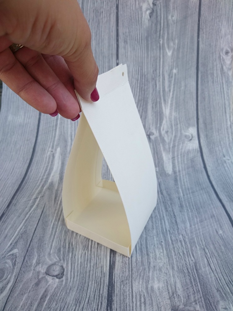Ker ima škatlica mere 9×9×9 cm, smo se odločili za višino embalaže 20 cm, na vsaki stranici pa smo dodali še 2 cm za zavihek, skozi katerega napeljemo satenast trak za zavezovanje.