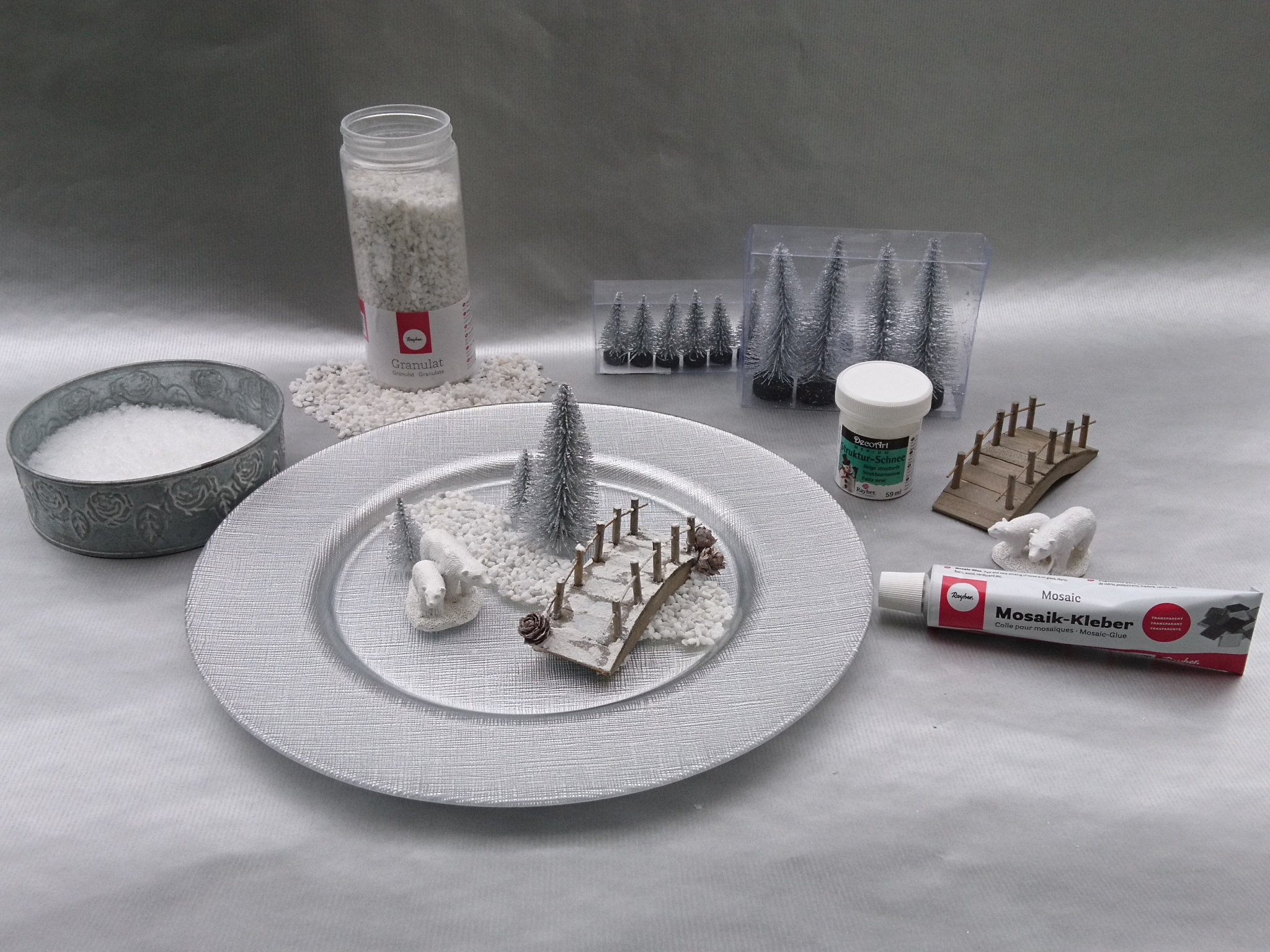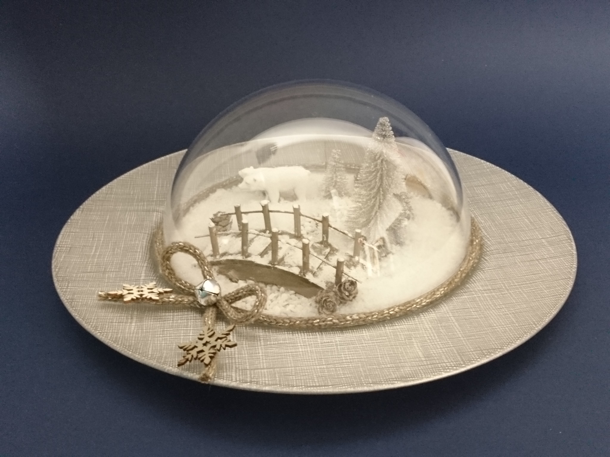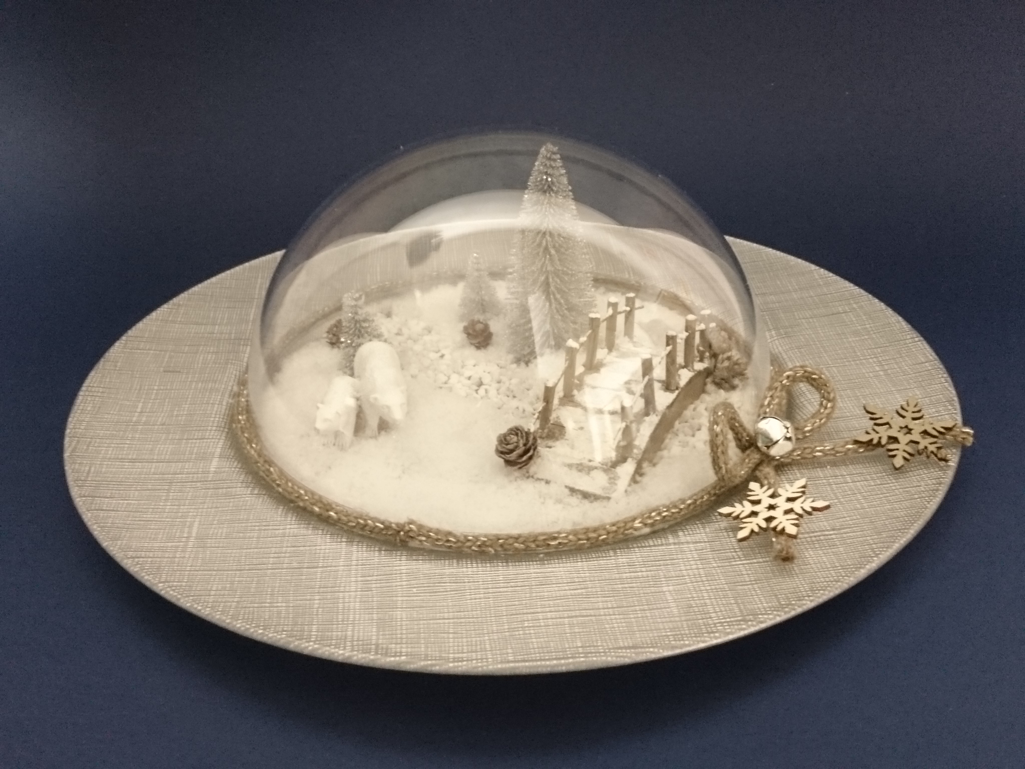 Leseno brv premažemo s strukturnim snegom, da dosežemo zasnežen videz. Kamenčke na krožnik prilepimo z lepilom za mozaik. Lepilo v debelejšem sloju namažemo po površini in nanj nasujemo kamenčke. Z istim lepilom prilepimo tudi leseno brv, medveda in smrečice. Po preostali površini posujemo snežene kosmiče. Na vrh zasnežene pokrajine položimo plastično polkroglo. Polkrogli na rob prilepimo okrasni trak s pentljo, na katero prilepimo še kraguljček in lesene snežinke.