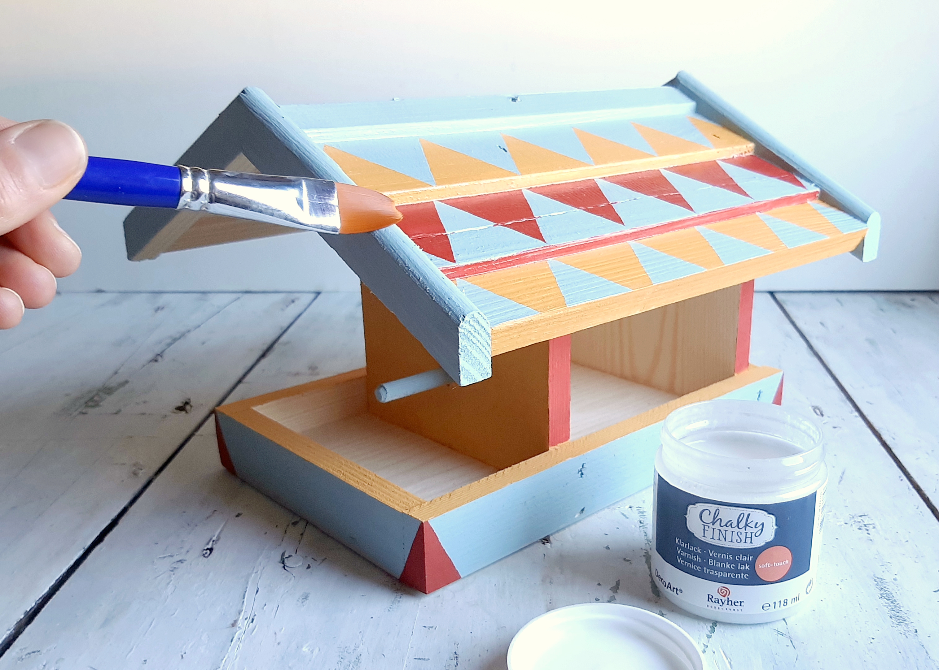 Ptičjo hišico polepšamo z živahnimi barvami Chalky Finish, ki omogočajo odlično prekrivnost in hkrati tudi zaščito lesa pred vremenskimi vplivi.