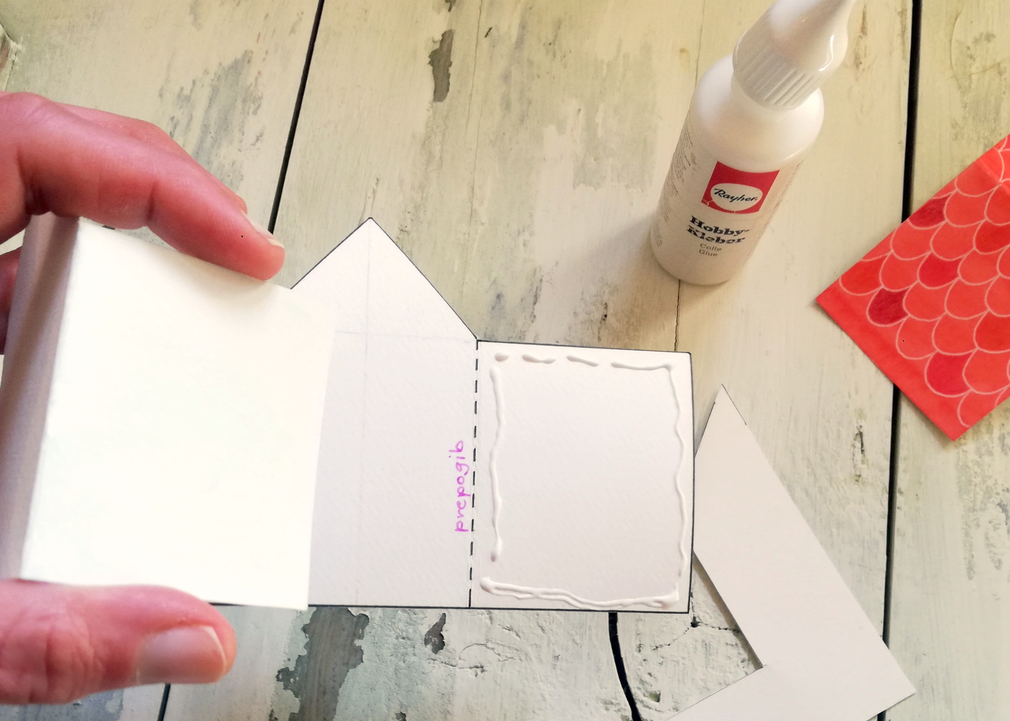 4.Hišico nato zalepite in lepilo nanesete tudi na rob, kamor boste postavili streho.