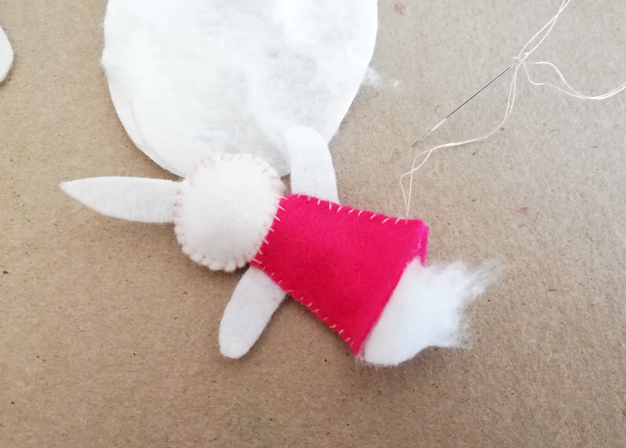 4. Ko pridemo do spodnjega dela trupa, kjer bomo dodali nogici, našo lutkico najprej napolnimo s polnilom in jo nato do konca sešijemo z dodanimi nogicami.