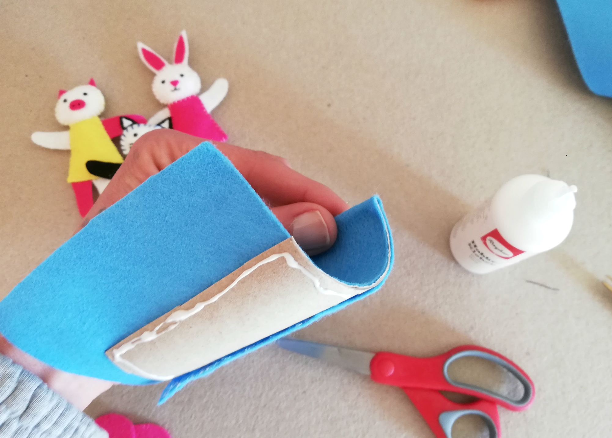 6. Rolico prerežemo na polovico in nanjo zalepimo filc.
