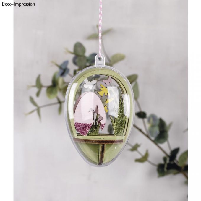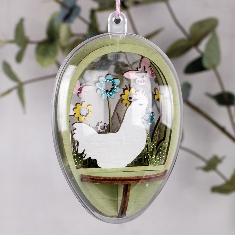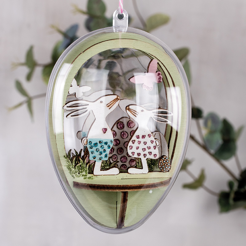 Preostane nam le še sestavljanje, kjer sledimo slikovnim navodilom na embalaži. Stike posameznih plošč utrdimo z lepilom za les in našo sestavljanko namestimo v prozorno plastično jajce. Skozi zanko napeljemo dekorativno vrvico in velikonočna dekoracija je pripravljena.