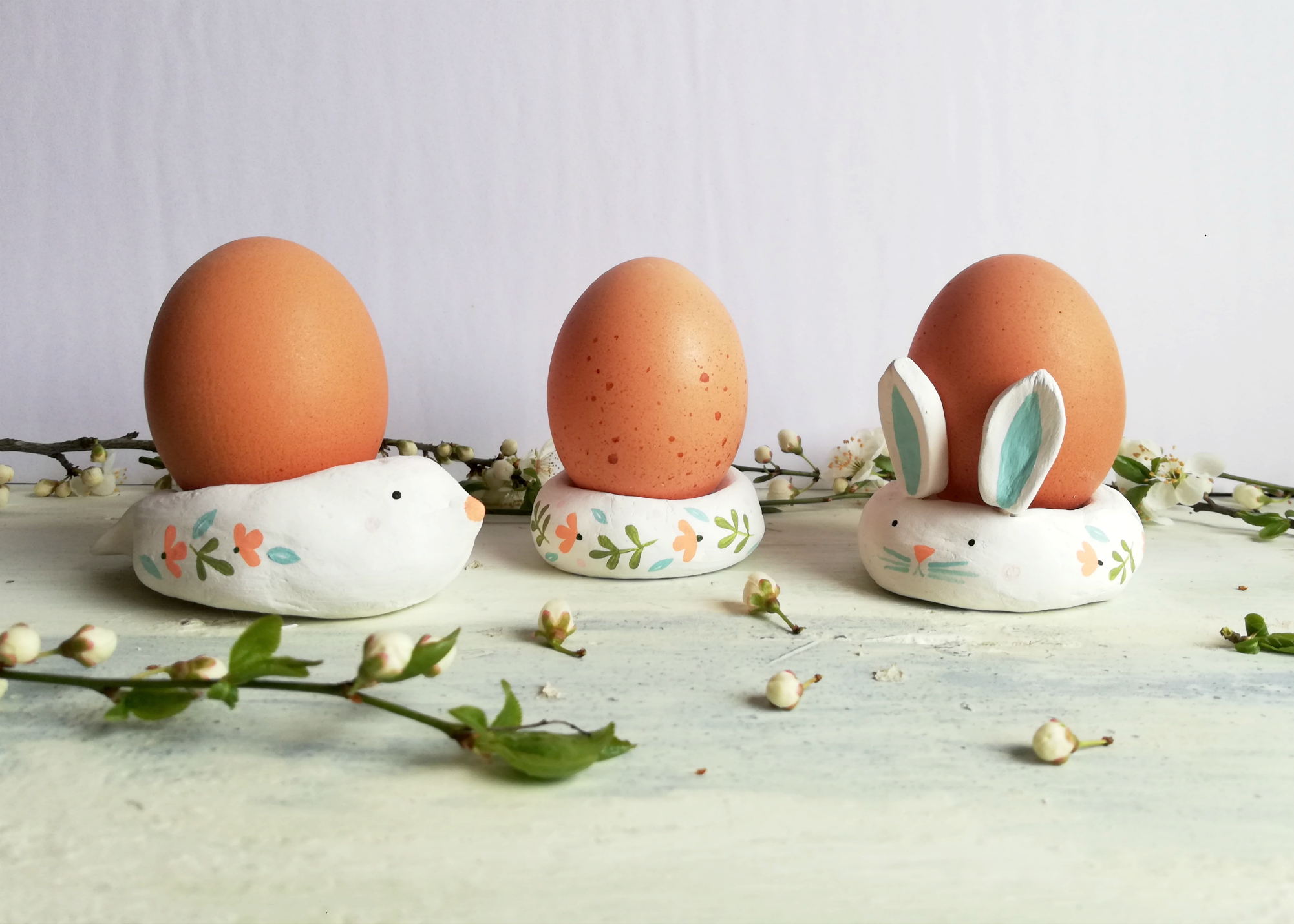 Iz modelirne mase, ki se suši na zraku, lahko skupaj z otroci naredimo pomladna gnezda, zajčke in ptičke - podstavke za pirhe.